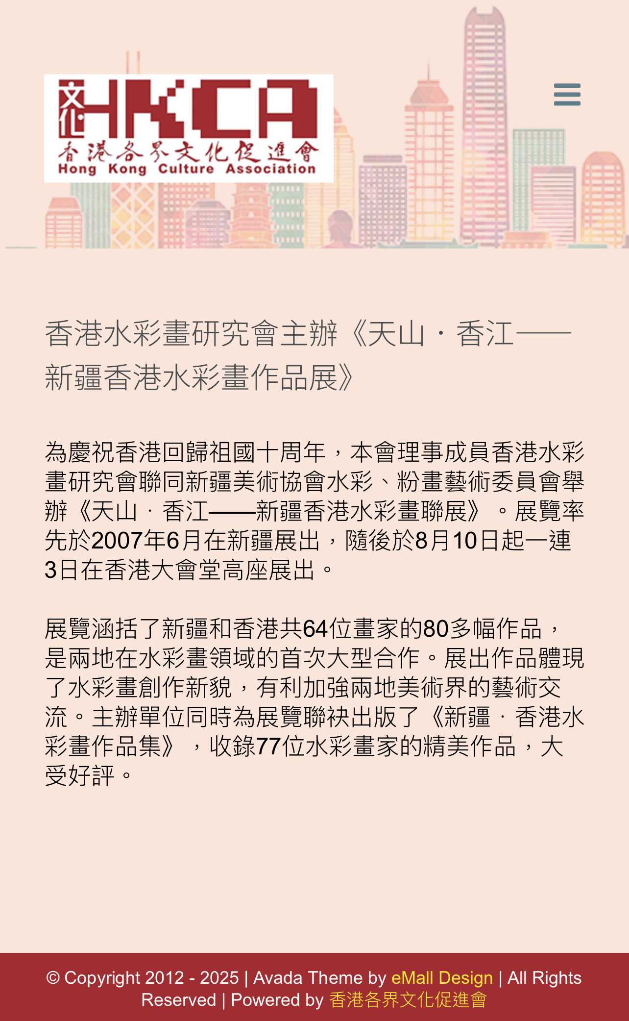 - 2007為慶祝香港回歸祖國十周年,香港水彩畫研究會聯同新疆美術協會水彩、粉畫藝術委員會舉辦《天山.香江——新疆香港水彩畫聯展》。展覽率先於2007年6月在新疆展出,隨後於8月10日起一連3日在香港大會堂高座展出。